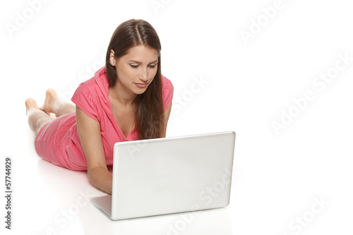 © paffy, Naklejka premium Casual woman using laptop lying on the floor