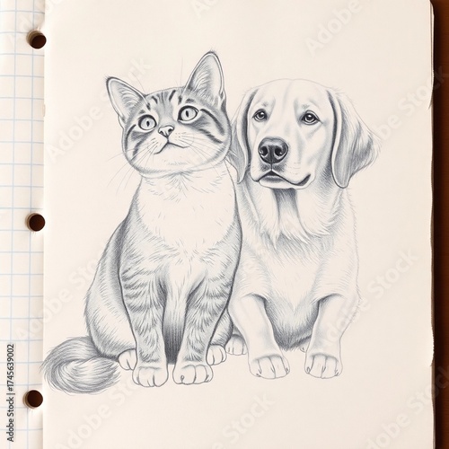 © PabloAndres, Obraz premium Cat and Dog Pencil Drawing