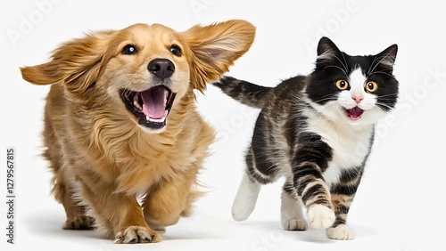 © Eazzy Designs, Obraz premium Cat and Dog Running and Playing Together, Showcasing Their Joyful Friendship on a White Background