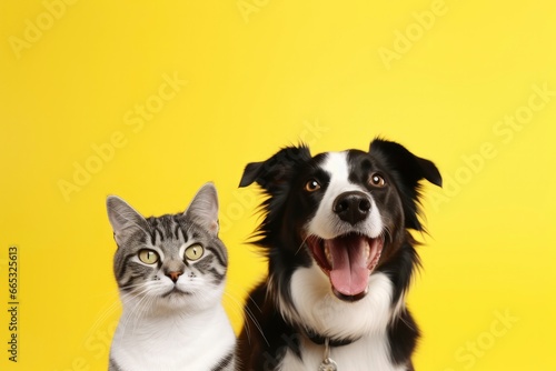 © Dibos, Obraz premium Cat and dog together with happy expressions on yellow background.