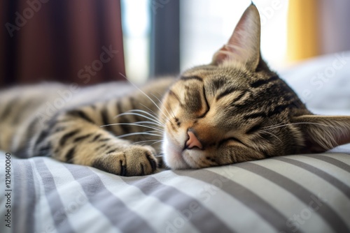 © Maryna, Obraz premium Cat Curled Up: Adorable Brown Tabby Sleeping Peacefully on a Cozy Bed