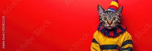 © BerkahStock, Obraz premium Cat dressed as a clown against a red background.