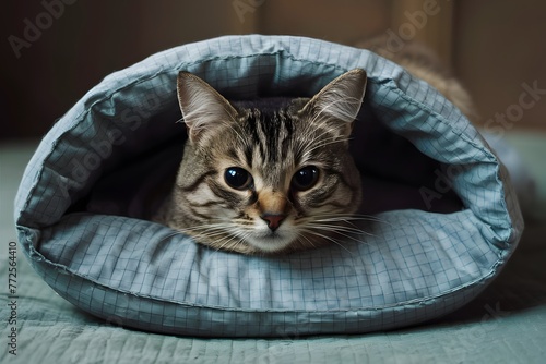 © Jawed Gfx, Naklejka premium Cat finds refuge and comfort nestled on a cozy bed