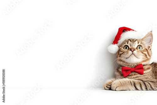 © Oksana_Latysheva, Naklejka premium Cat in a Festive Santa Hat and Bow isolated on background
