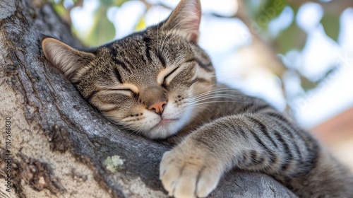 © atipong, Fototapeta premium Cat in a tree lookinng and sleeping cute cat looking after birds to hunt playful cat want to play