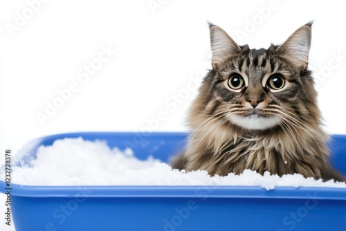 Fototapeta premium Cat in Blue Tray Filled with Snow, Playful and Cute Expression