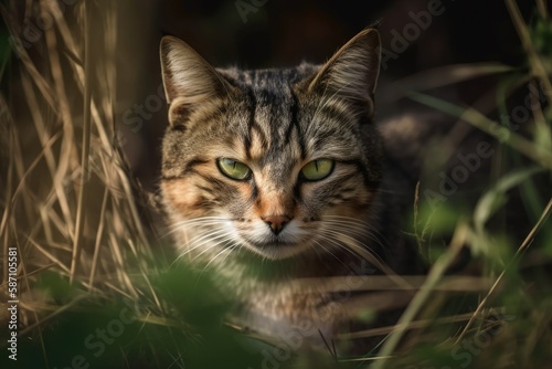 Fototapeta premium Cat in the grass concealing. Generative AI