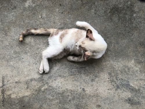 © Watcharin, Fototapeta premium Cat laying down on cement ground floor,cleaning itself with comfortable gesture