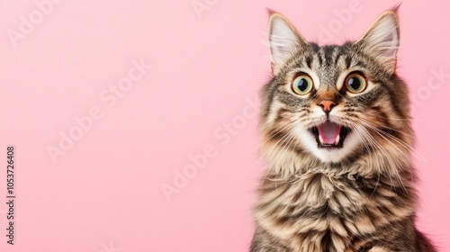 © 69, Obraz premium Cat looking shocked, paws up by face, pink background for contrast and copy space.