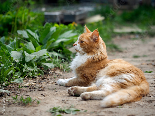 Fototapeta premium Cat on a footpath. Cat red, street, homeless. Green grass. Fuzzy cat fur is...