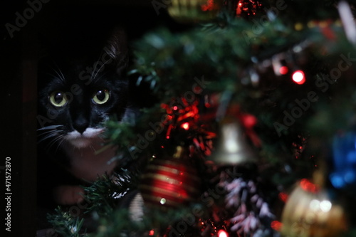 © Cinthia, Obraz premium cat on christmas tree