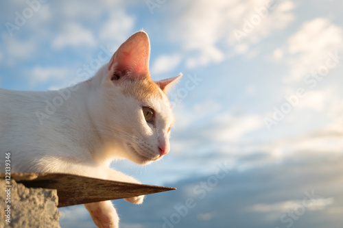 Fototapeta premium Cat on the roof and blue sky background,Looking.