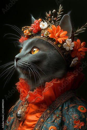 Naklejka premium Cat Portrait in Festive Costume– Vibrant Carnival Artwork for Posters, Wall...