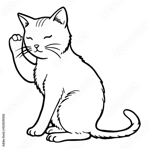 Obraz premium Cat silhouette grooming itself with raised paw, isolated on white background