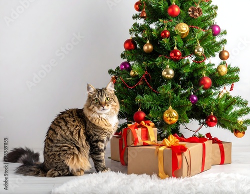 © Istirokah, Obraz premium Cat sits beside a festively decorated Christmas tree and gifts