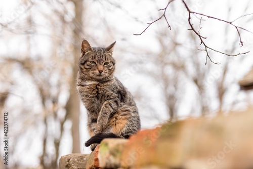 © Djordje, Obraz premium cat sitting on brick wall isolated