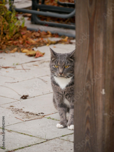 Naklejka premium Cat sitting outdoors on the patio, looking at the camera. Grey tabby cat portrait.