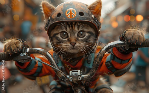 Fototapeta premium Cat wearing a peace sign helmet riding a bicycle