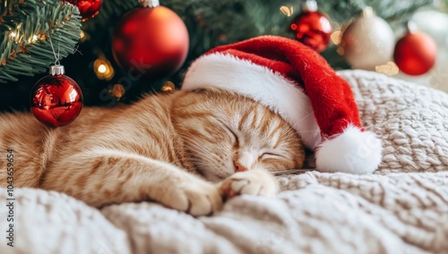 © Roey, Obraz premium Cat Wearing Santa Hat Sleeping Under Christmas Tree with Cozy and Festive Atmosphere