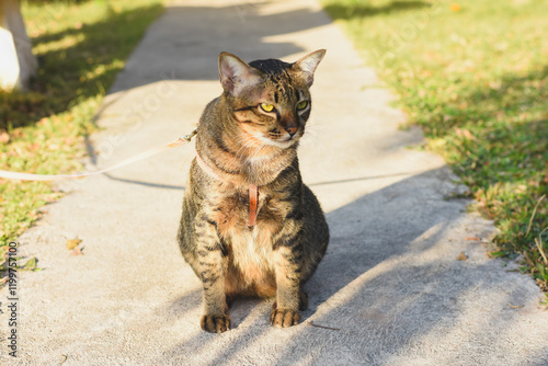 © Aphisith, Naklejka premium cat with a tabby coat pattern sitting on a concrete path
