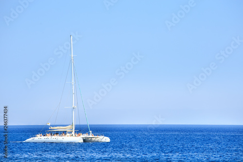 Obraz premium Catamaran with tourists with blue sky and water. Vacation background.