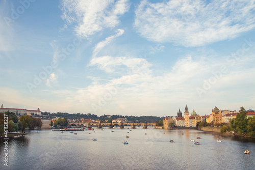Fototapeta premium Catamarans on Vltava river near the Charles bridge at sunset light. Prague old town.