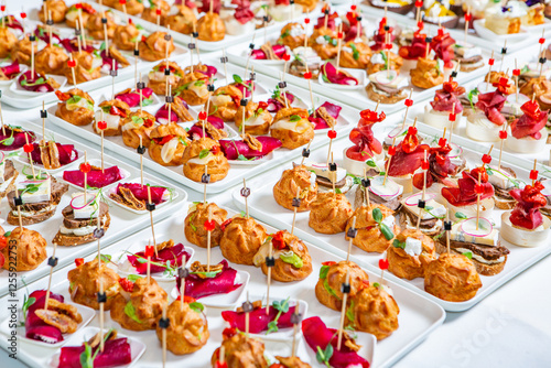 Fototapeta premium Catering buffet or service with different snacks, appetizers and canapes on a...
