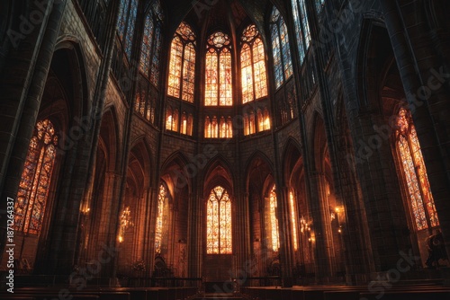 Obraz premium Cathedral interior with stained glass windows during sunset in a historic...