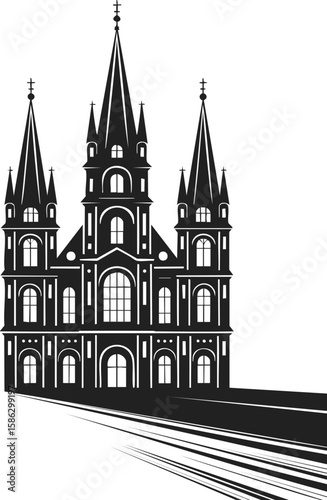 © Сергей Тарасюк, Fototapeta premium Cathedral silhouette, gothic architecture, vintage engraved castle, historic landmark, architectural design inspiration