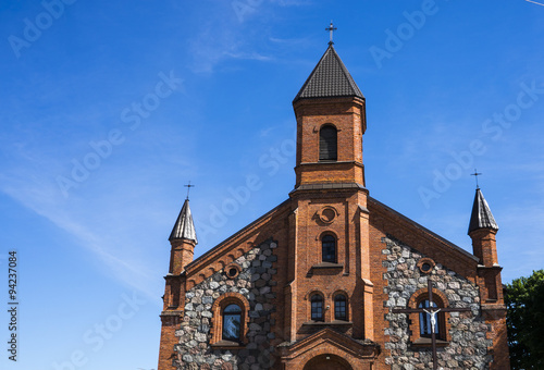 Fototapeta premium Catholic church in Belarus against blu sky