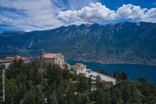 © Berg, Fototapeta premium Catholic church on a mountain surrounded by the Alps. Panorama Eremo di Montecastello, Italy aerial view. Aerial panorama of the Eremo di Montecastello church on Lake Garda.