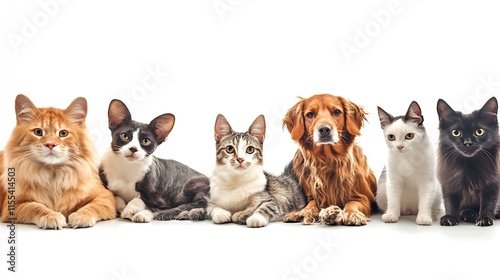 © Generative AI, Obraz premium Cats and Golden Retriever Lined Up in Perfect Pet Harmony : Generative AI