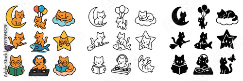 © Svitlana, Fototapeta premium Cats and kittens icon collection: silhouette, linear, flat styles. feline and pet symbols