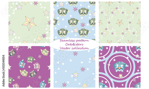 Fototapeta premium Cats and stars seamless pattern. Pastel wallpaper color. Large print seamless illustration. Decoration design in a circle. 6 vector collection