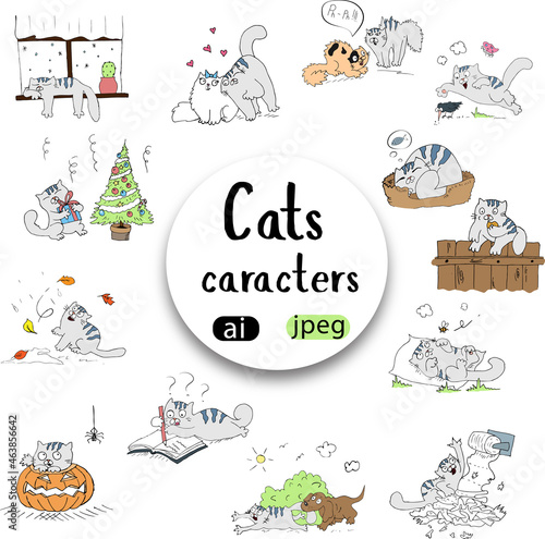 Fototapeta premium Cats caracters in doodle style. Cat adventures.Vector. Cat set.