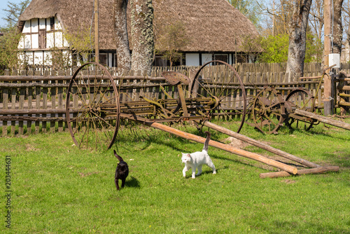 © vivoo, Obraz premium Cats playing in the yard. Rural landscape