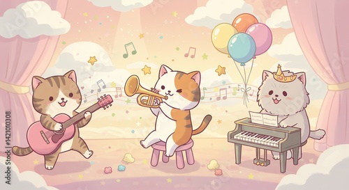 Fototapeta premium Cats Playing Musical Instruments on Stage Cartoon Illustration