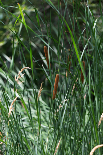Fototapeta premium cattails or bulrushes in a marshy area of the park