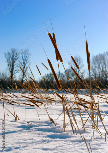© Coprid, Fototapeta premium Cattails (Typha) at frozen winter forest lake