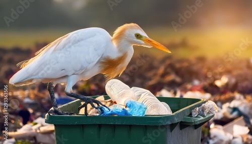 Obraz premium Cattle Egret Bubulcus ibis Scavenging through Trash with a Determined Eye and...