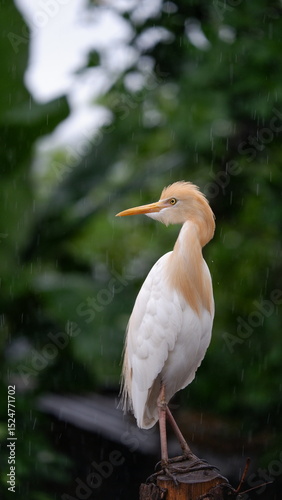 Obraz premium Cattle Egret in rain. These are the only member of monotypic genus Bubulcus