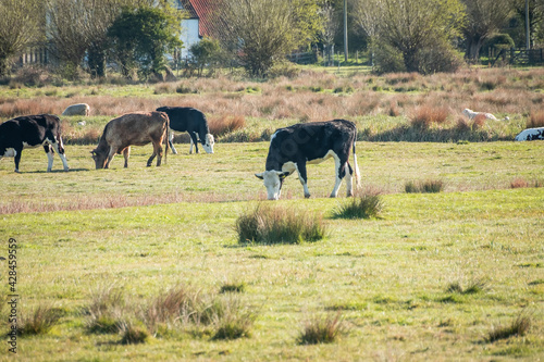 Fototapeta premium Cattle grazing in the marshes beside the River Thurne in Norfolk on a bright...