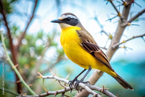 © Arnada, Fototapeta premium Cattle Tyrant Balancing on Dry Branches in Panoramic Nature Scene