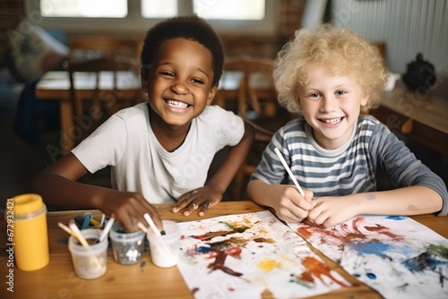 © yj, Fototapeta premium caucasian and afro male children painting together on table. generative AI
