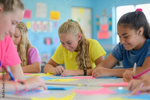 © Ryzhkov, Fototapeta premium Caucasian and Hispanic high school students setting learning objectives in a bright, collaborative classroom with dedicated teacher guiding them during the day