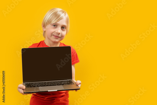 Naklejka premium Caucasian blond boy holds an open laptop with blank black screen. Studio photo of child with laptop. Copy space.