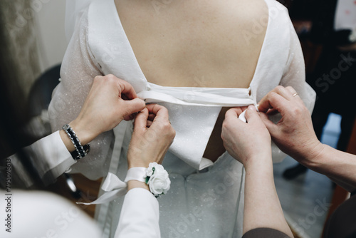 © Mikalai, Fototapeta premium Caucasian bride holding dress