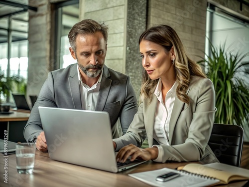 Fototapeta premium "Caucasian Businessman and Woman Collaborating on Project in Modern Office –...