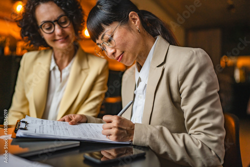 © Miljan Živković, Fototapeta premium caucasian businesswoman give to japanese female client contract to sign