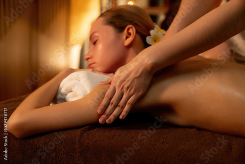 Fototapeta premium Caucasian couple customer enjoying relaxing anti-stress spa massage and pampering with beauty skin recreation leisure in warm candle lighting ambient salon spa at luxury resort or hotel. Quiescent